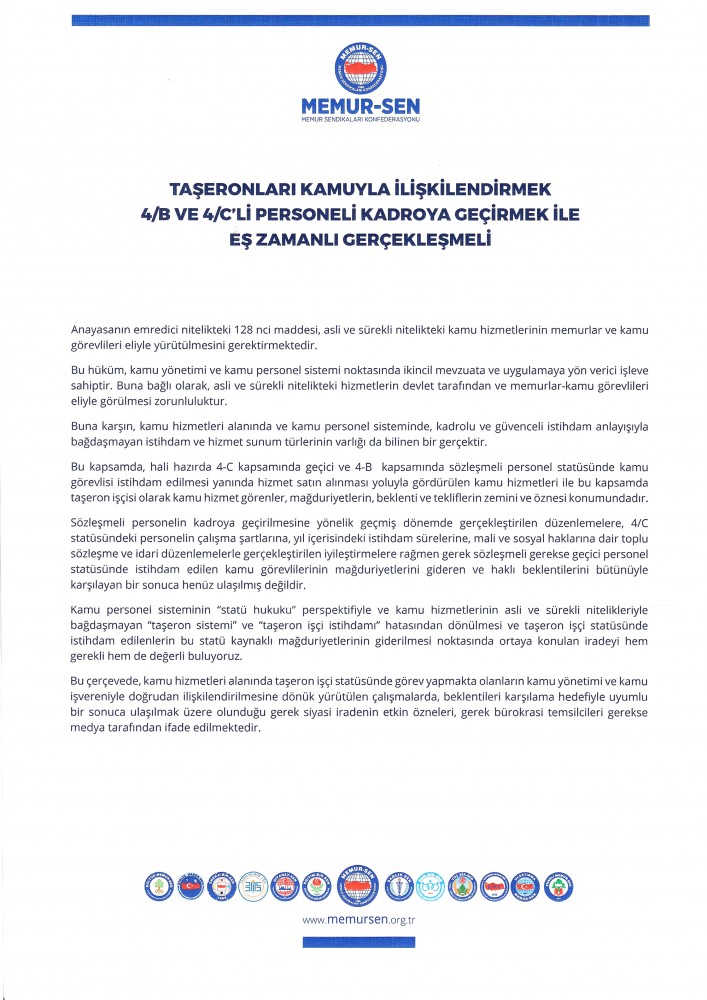 Taşeron işçilerinin kadroya geçirilmesine ilişkin her türlü süreci desteklediklerinin altını çizen Memur-Sen bunun yanında, “Kamu personel sistemi içerisinde yer alan ve fiilen de kamu hizmeti sunmakta olan 164 bine yakın sözleşmeli personel ile 20 bini aşkın 4/C kapsamındaki geçici personel olmak üzere 185 bine yakın kamu görevlisinin kadrolu ve güvenceli istihdamla ilişkilendirmesinin de taşeron işçilerle ilgili düzenlemeyle birlikte gerçekleşmesi ve sonuca bağlanması uygun olacaktır” değerlendirmesinde bulunuyor.