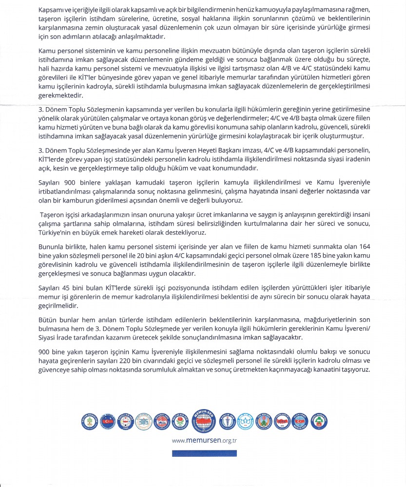 Yazıda, “3.Dönem Toplu Sözleşmesi’nin kapsamında yer verilen ve Kamu İşveren Heyeti Başkanın da imzasının bulunduğu 4/C ve 4/B kapsamındaki personelin, KİT’lerde görev yapan işçi statüsündeki personelin kadrolu istihdamla ilişkilendirilmesi noktasında siyasi iradenin açık, kesin ve gerçekleştirmeye talip olduğu hüküm ve vaat konumundadır” ifadeleri yer alıyor.