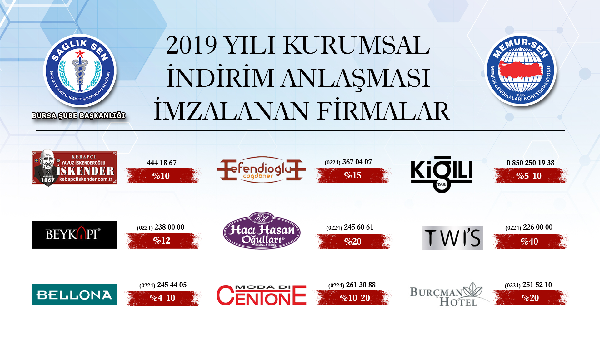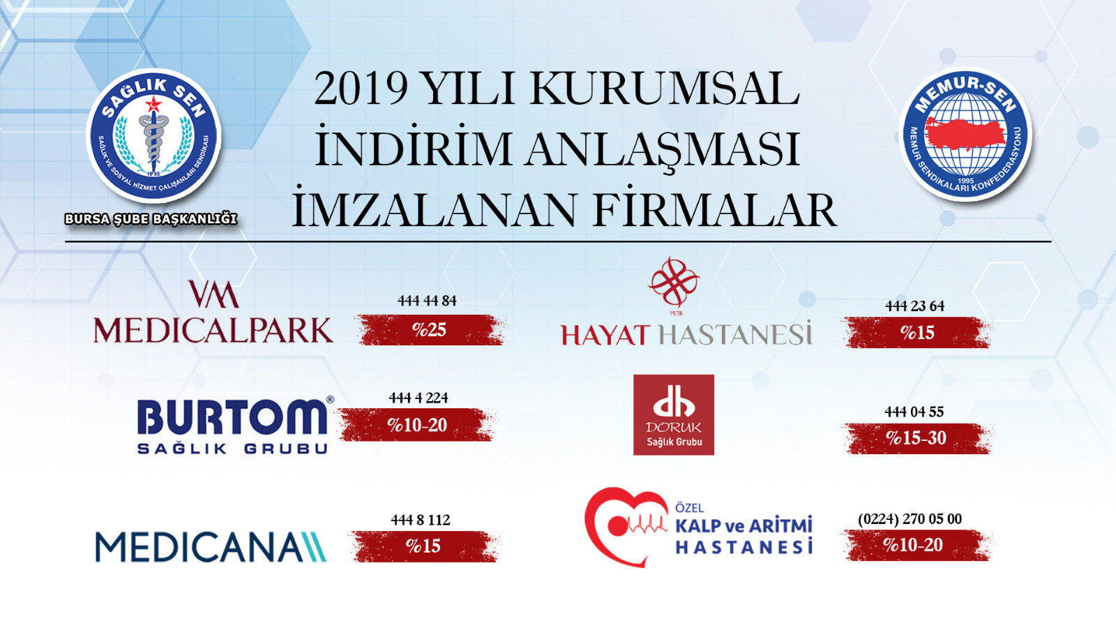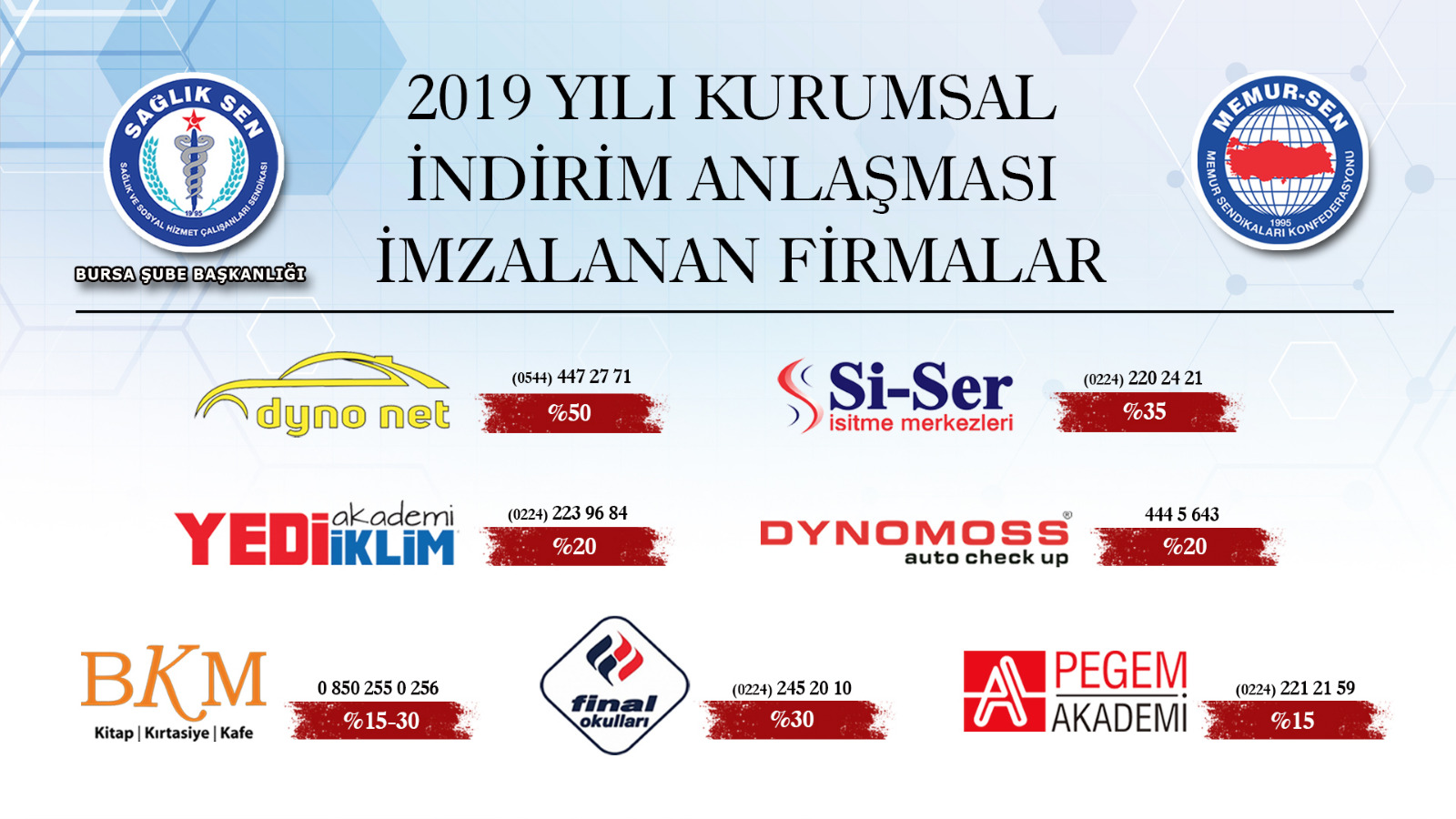 Memur-Sen İl Temsilciliğimiz ve Sağlık-Sen Bursa Şube Başkanlığımız tarafından üyelerimize yönelik indirim anlaşmalarımız gerçekleştirilmiştir. Üyelerimiz üye kimlik kartlarını göstererek indirimlerden faydalanabilirler. Hayırlı olsun.